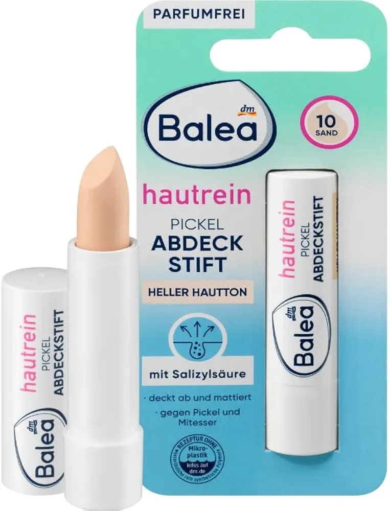 کانسیلر قلمی نرم و شفاف Balea، رنگ 10.4.5 گرم. حاوی اسید سالیسیلیک ضد جوش و دانههای سرسیاه، سازگاری با پوست، ضد باکتری، آزمایش شده توسط متخصصین پوست.
